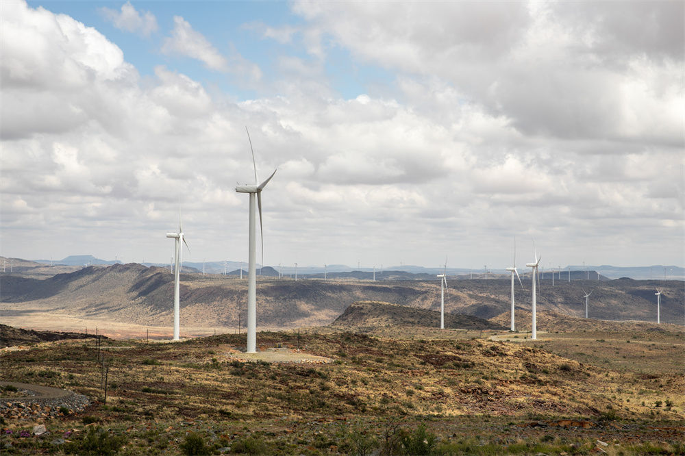 这是2021年11月22日在南非北开普省德阿镇拍摄的中国龙源电力集团南非公司运营的德阿风电项目风机。新华社记者 吕天然 摄
