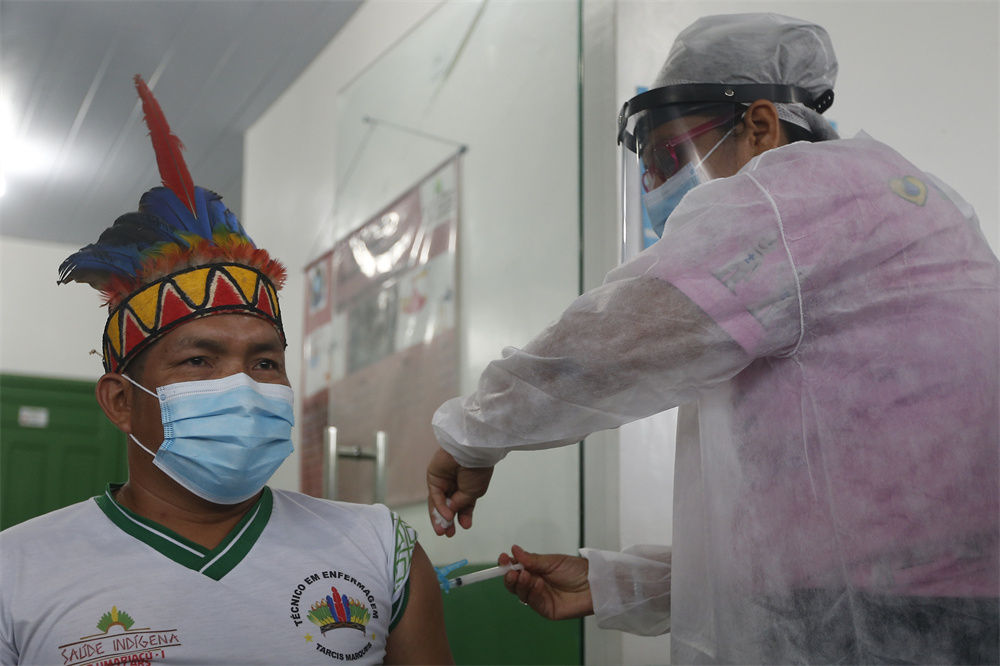 这是2021年1月19日,医护人员在巴西亚马孙州塔巴廷加市为一名原住民接种中国新冠疫苗。新华社发(卢西奥·塔沃拉摄)