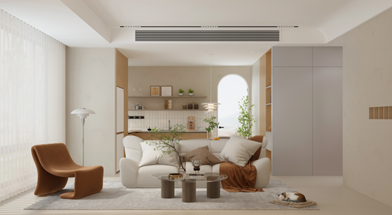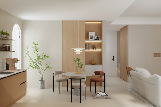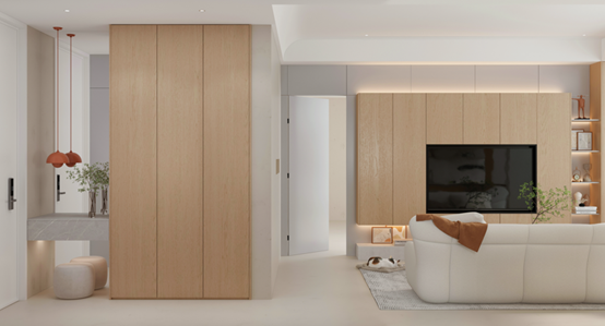 温润的原木色玄关柜,点缀岩纹抽屉,色彩浅淡又不失生机。入户极简全身镜,让人增添出门时的自信。遵循LDK设计原则的客餐厨一体化空间是这款产品设计的点睛之笔,它打破固有的功能空间,用通透的设计处处体现家居空间的互动感。隐形门和护墙组合,是藏在电视柜后的乐趣,大面积的储物空间,让客厅不再凌乱。开放层板做点缀,呼应氛围层板灯,仿佛电视剧里的浪漫满屋。