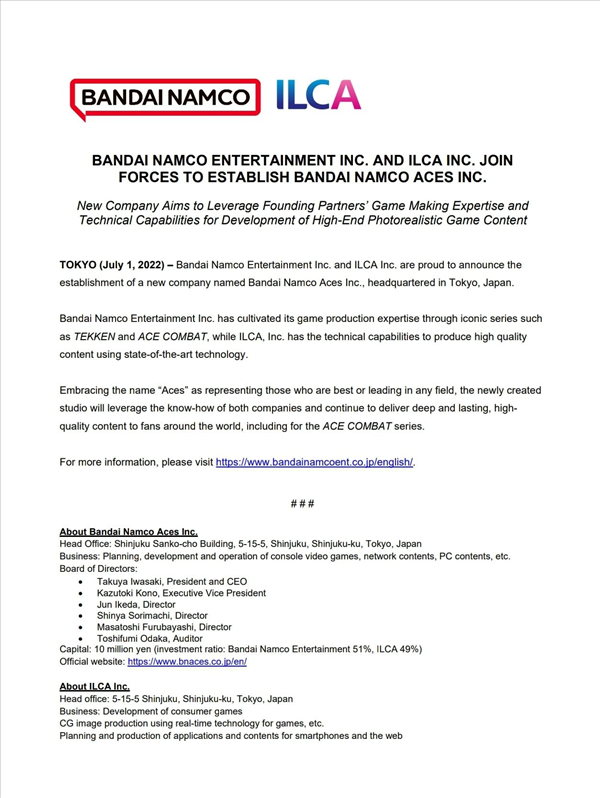 今日(7月1日)万代南梦宫宣布将与ILCA联合成立新公司「BANDAI NAMCO ACES」,公司主要负责主机游戏和网络游戏的企划、开发和运营等业务。官方表示在当前游戏行业的促进下,为了加强游戏开发能力,并追求更加真实的表现力,所以决定两家公司强强联合。