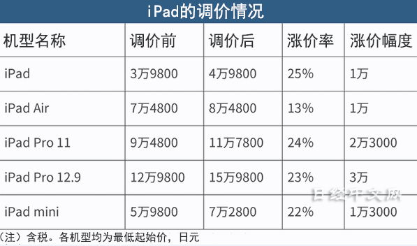 除了6月已重新定价的个人电脑“Mac”系列,此次调价涉及苹果的多种产品。平板电脑“iPad”的价格上涨25%,调整至4.98万日元(约合人民币2471元)起,手表型终端“Apple Watch”的各机型也都上调了价格。