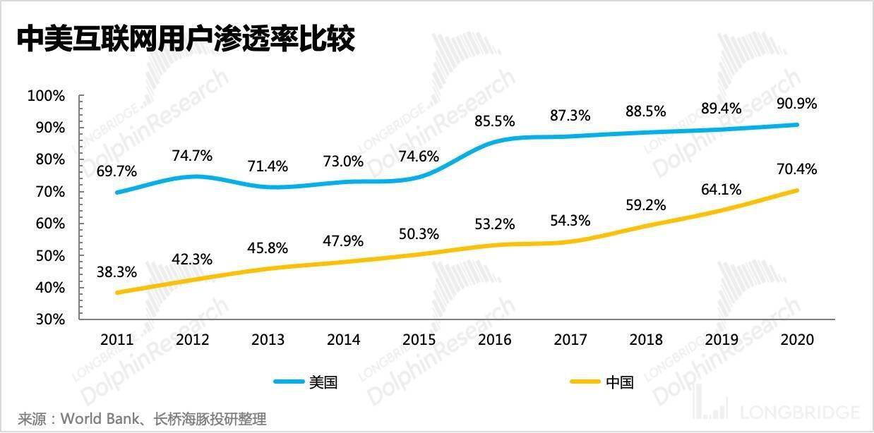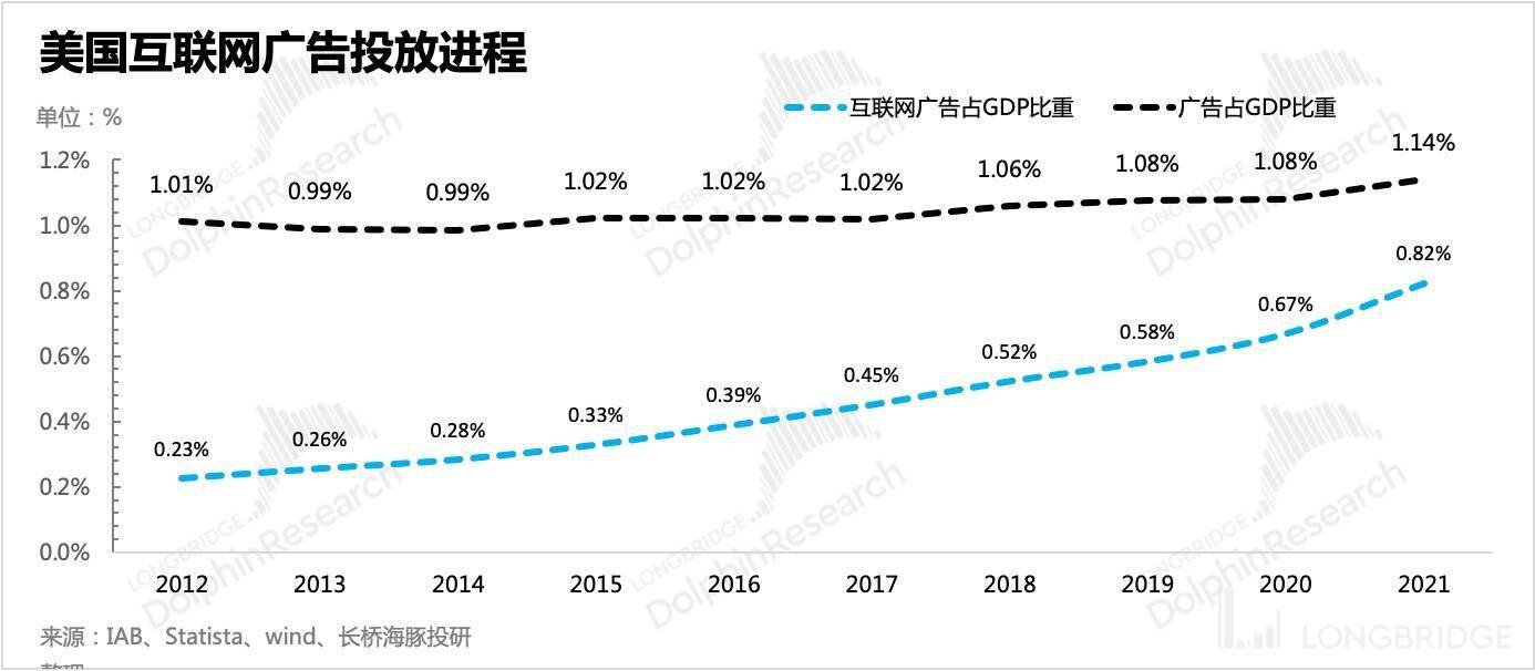 海豚君认为,如果对比中美两国互联网用户情况,就能发现美国目前的互联网渗透率和用户时长均高于中国,但 2020 年的时候两国的互联网广告占整体广告比重却基本相同(60%)。尽管 2021 年美国的互联网广告占比已经实现大跨步的提升,但我们认为,由于美国近乎人人都上网的极致渗透率下,广告线上化短期仍然有可能进一步提升。