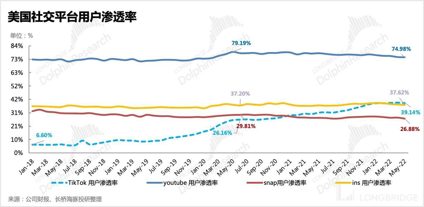 而回顾 2018 年至今的渗透率趋势,YouTube 在 2020 年二季度美国疫情时候达到巅峰之后,就开启了缓慢下行的节奏,除了今年以来全球封控放开线上活动热度转淡的原因外, TikTok 对 YouTube 用户的抢夺影响已然体现。