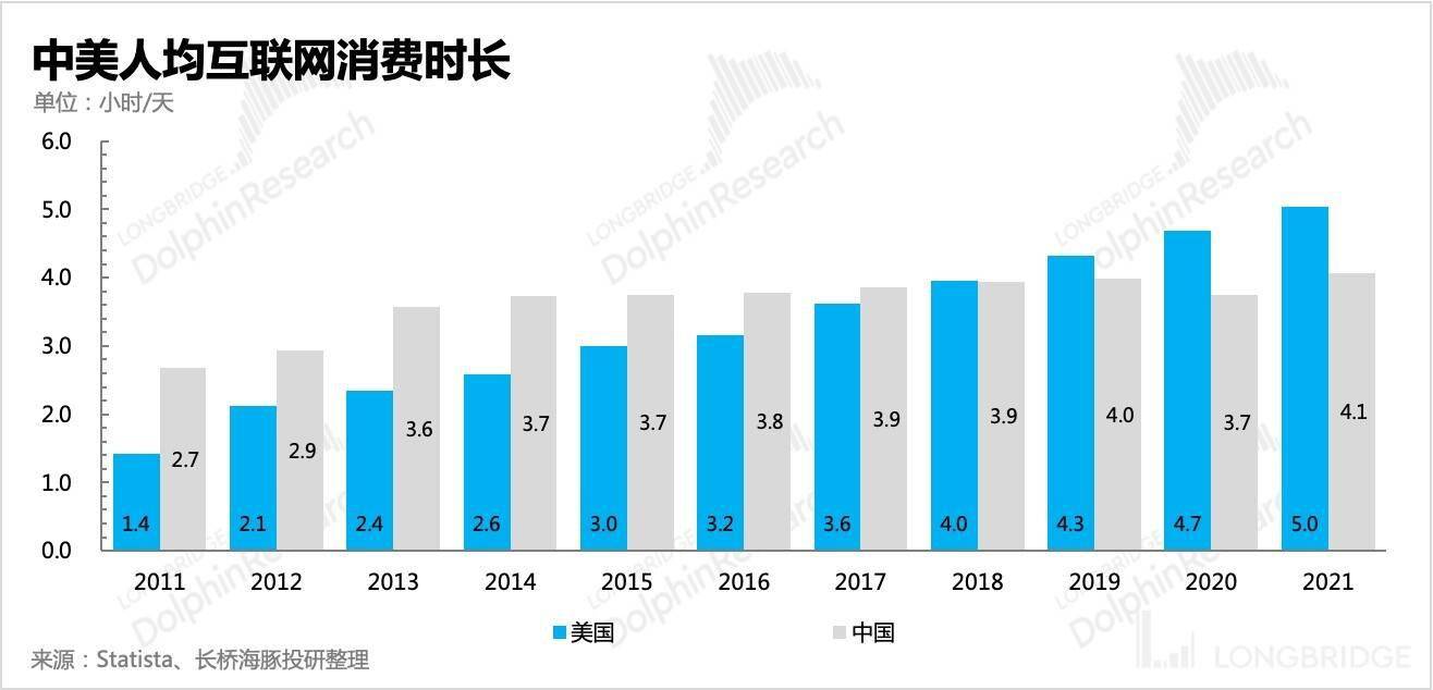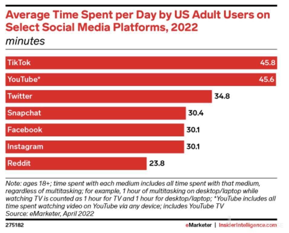 两点注意,目前市场上另一个传播较广的日均时长数值是来自于 eMarketer 的估测(~45 分钟)。虽然两个数据对比差距有点大,但实际上两者定义有区别。