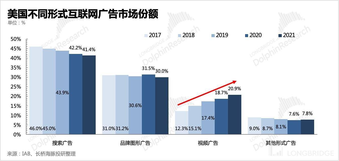 2021 年视频广告再次以大幅领先行业的加速增长,占整体广告比重由疫情前(2019 年)的 17% 跃至 21%,两年复合增速高达 35%。