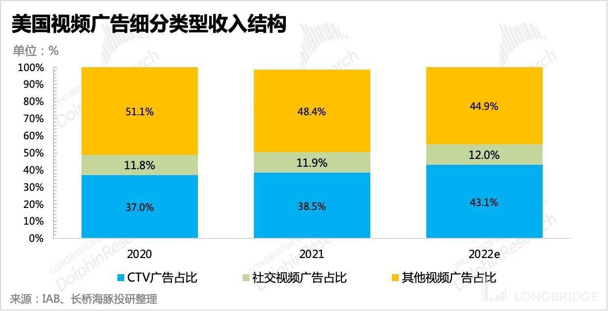 2)与中国短视频定义类似的「社交视频广告」,增速略不及 CTV 广告,但仍然超过整体数字视频行业的增速,因此在行业中的份额占比也在爬升中。