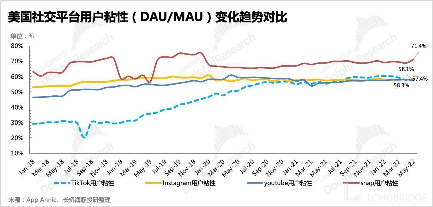 虽然从下图的用户粘性趋势上看,TikTok 似乎从 2020 年四季度至今徘徊在一个 55%-60% 区间的平台期。但海豚君需要提醒的是,在此期间的 TikTok 还处于一个高速获客的阶段(增加了 4000 万人,在此前的基础上增加了近 50%),按照新用户粘性低,老用户的粘性更高的基本逻辑,当这部分新用户不断变成老用户的过程中,整体的用户粘性(DAU/MAU)自然会探到更高的水平。