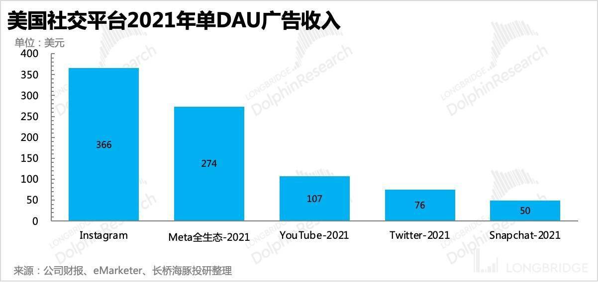 以美国市场为例,在 eMarketer 的预期下,TikTok 在美国的单 DAU 广告收入对应 110 美元,如果按照 2021 的财务数据,基本上将 TikTok 的变现效率看做了当前 YouTube 的水平。