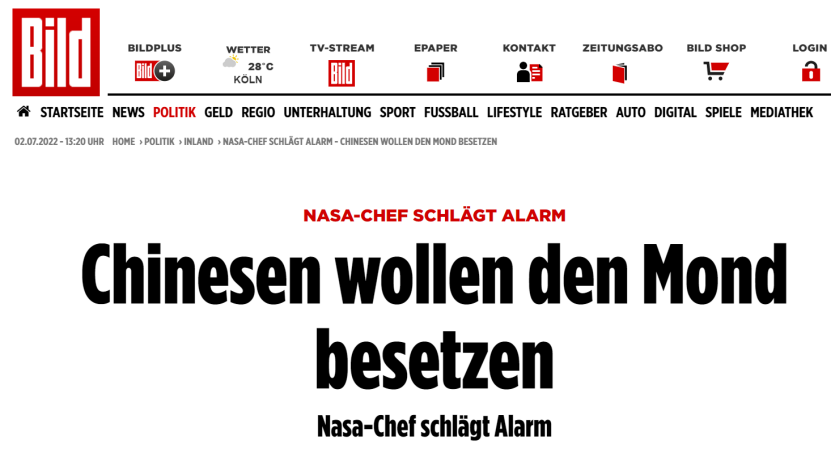 “NASA局长警告:中国想占领月球”,德国《图片报》网站7月2日以此为题刊登了对NASA局长尼尔森的采访。尼尔森在采访中声称,“中国可能登陆月球,并说‘现在这是我们的了,你们别过来。’我们应该对此感到担忧。”