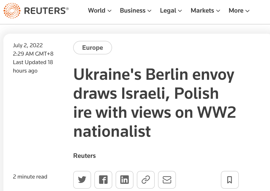路透社2日报道,一名博客记者6月30日发表了一篇对梅利尼克的采访报道,后者在采访中为斯捷潘·班德拉辩护,称班德拉不是“屠杀波兰人和犹太人的凶手”。