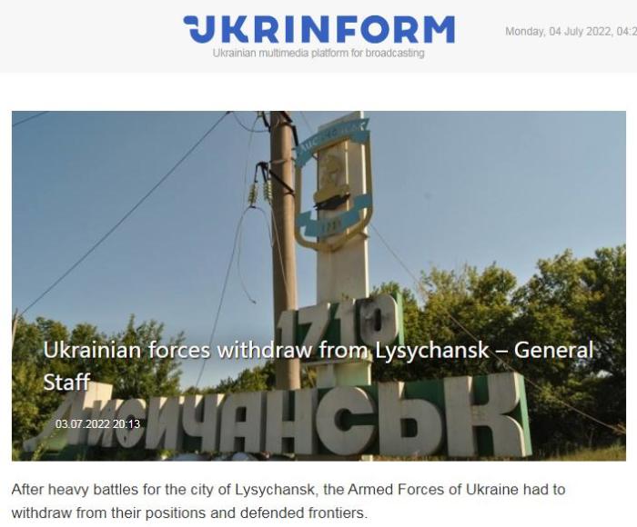 中新网7月4日电 综合报道,当地时间7月3日,乌克兰武装力量总参谋部在社交媒体上发表声明称,在经历了激烈的战斗后,乌克兰军队被迫撤出利西昌斯克。