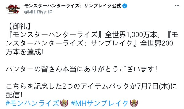《怪物猎人:崛起》得益于持续的免费更新以及PC版、捆绑版的推出,全球销量也突破了1000万。为表庆祝,官方将于7月7日在游戏内送出两个道具包,具体详情将在后续公开。