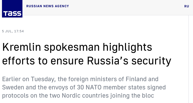 此外,据报道,关于对芬兰和瑞典加入北约的进程,佩斯科夫回应说:“总统(普京)已经澄清了他的立场,没有什么可补充的。”
