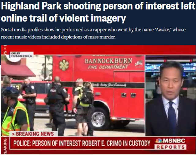 据美国国家广播公司(NBC)7月5日报道,周一,芝加哥郊区发生枪击案,造成6人死亡,38人受伤。警方随后确认了嫌疑人罗伯特·E·克里莫三世(Robert E. Crimo III)的身份,根据多个似乎属于他的社交平台账号,他在网上留下了大量对大规模枪击案和公开杀人事件的赞颂之词。