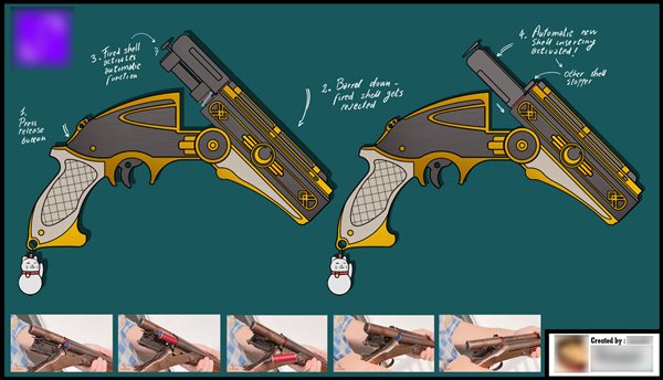 这个机构这有点像把泵动式霰弹枪的复杂机械内构,用螺栓固定到枪外面。虽然怪异但看起来很酷,非常适合《猎杀:对决》19世纪末期魔幻题材的画风。