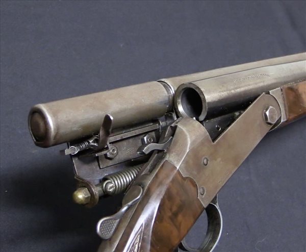 Alofs看起来就是早期枪支设计中常见的,那种异常笨拙地用螺栓固定在一起的技术。通过将一个管状弹仓附件拧到中折式霰弹枪的外部,Alofs可以将单发霰弹枪转变为五发弹容量的半自动霰弹枪。