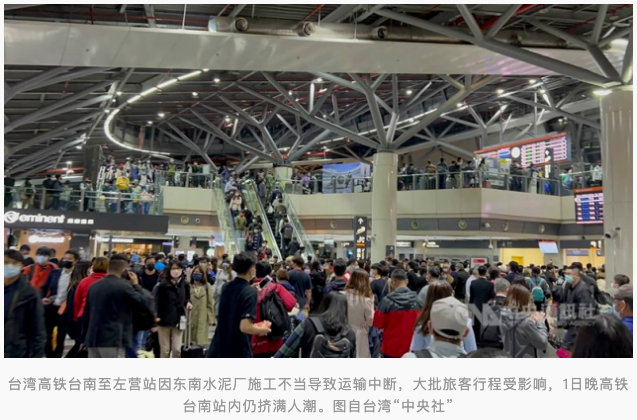 “中央社”等台媒消息称,台湾高铁左营站附近的东南水泥旧厂区1日施工不慎,导致水泥高塔倒塌,压毁高压电塔,造成高铁电力中断,左营-台南停驶约7小时,影响“双铁”(高铁、台铁)逾百班次、12.6万人。 台湾高铁台南至左营站因东南水泥厂施工不当导致运输中断,大批旅客行程受影响,1日晚高铁台南站内仍挤满人潮。图自台湾“中央社” 报道称,发生在1日下午3时40分的东南水泥旧厂区事故导致高铁电力中断,左营-台南双向停驶,台铁也配合台电抢修作业,从1日晚间6时46分开始,左营-楠梓间断电封锁营运中断,截至1日晚间11时,影响“双铁”逾百班次、12.6万人。其中,估计高铁有79班列车、11.4万名乘客受影响;台铁估计,有30列次、1.2万名乘客受影响。 台高铁公司在事故发生后随即成立紧急应变中心,高铁人员进场抢修,晚间10时40分抢修完成、恢复双向运转;台铁也在晚间8时51分通电,晚间9时20分恢复双线通车。
