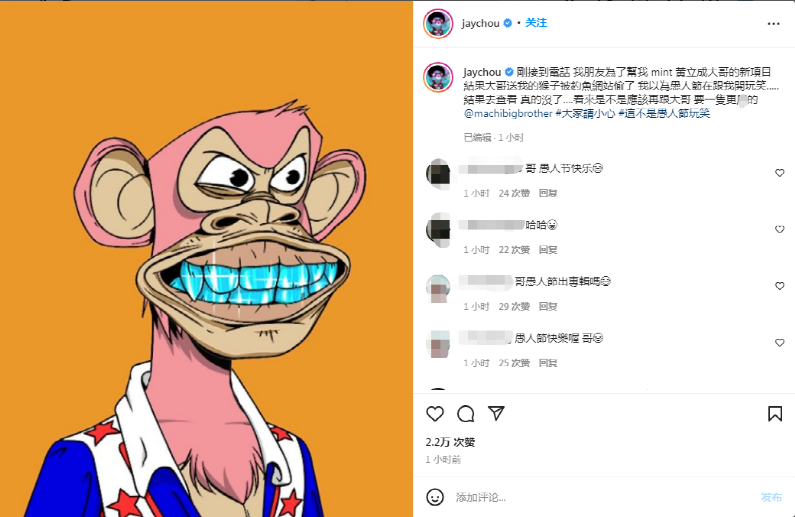 4月1日,周杰伦在社交媒体上发文确认,曾由黄立成(MachiBigBrother)赠予的无聊猿BAYC(Bored Ape Yacht Club) #3738 NFT已被盗,疑似被钓鱼攻击。