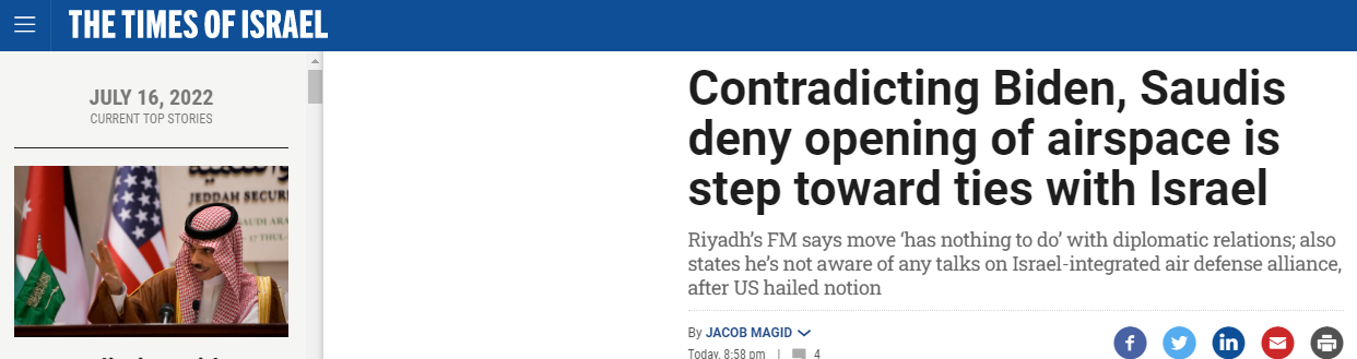 《以色列时报》介绍,拜登曾于15日晚和沙特萨勒曼、沙特王储穆罕默德·本·萨勒曼会晤后称,利雅得方面开放领空的决定意义重大,“不仅是象征性的,更是实质性的(举措)”。报道称,拜登还表示,这是其“希望(沙以关系)最终迈向更广泛、正常化路上的第一步”。值得注意的是,同日上午,以色列总理拉皮德也发表简短声明,对沙特向包括以色列航空公司在内的所有航空公司开放领空表示感谢。