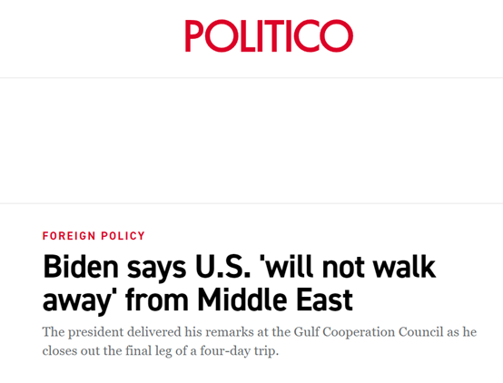 由6个海湾合作委员会成员国以及美国、埃及、约旦、伊拉克领导人参加的“安全与发展”峰会当地时间7月16日在沙特阿拉伯西部海滨城市吉达闭幕。美国政客新闻网说,此行是拜登为期四天的中东访问的最后一站。据白宫网站实录,在这场峰会上,拜登表示,美国“不会离开”中东。