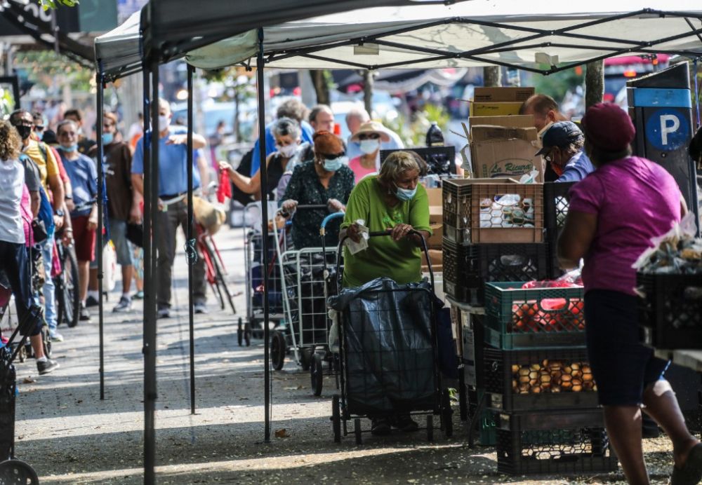 2020年8月8日,人们在美国纽约街头的免费食物发放点领取食物。新华社记者王迎摄