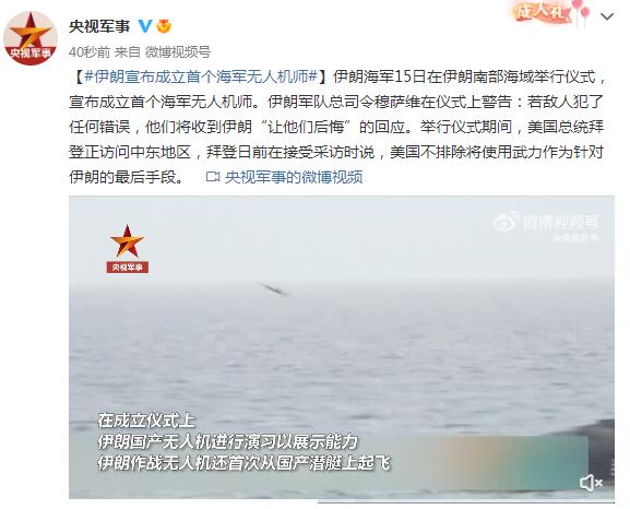 伊朗海军15日在伊朗南部海域举行仪式,宣布成立首个海军无人机师。伊朗军队总司令穆萨维在仪式上警告:若敌人犯了任何错误,他们将收到伊朗“让他们后悔”的回应。举行仪式期间,美国总统拜登正访问中东地区,拜登日前在接受采访时说,美国不排除将使用武力作为针对伊朗的最后手段。