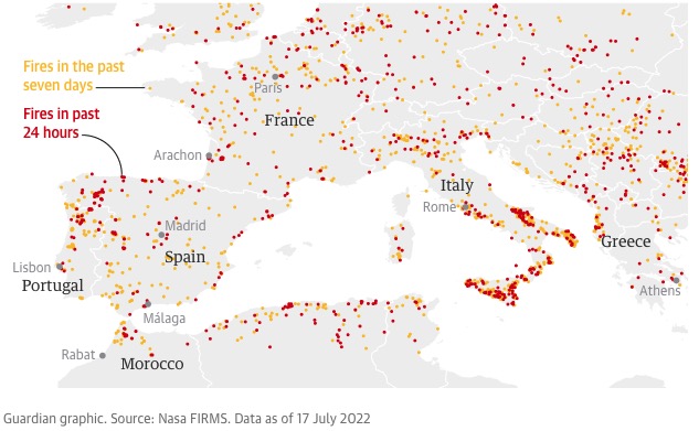 在情况最严重的南欧地区,西班牙、葡萄牙和法国在持续多日的热浪中与失控的野火持续搏斗。7月17日,其中一场大火蔓延到两处游客众多的大西洋海滩边。迄今为止,至少已有1000多人因高温而死亡。