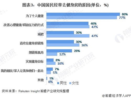 疫情后更多人愿意在健身上投入时间和精力随着人们健康意识增强,出于对自身健康的考虑,人们愿意在运动健身上投入更多的时间和精力。对2020年中国健身人群调查显示,约43%的男性拥有健身房会员资格,而女性比例为50%,主要是由于女性对健身的环境的舒适度的追求高于男性,所以女性在选择上更为优先选择健身房进行健身。在对去健身房原因调查中,约77%的女性受访者和80%的男性表示为了身体健康,他们经常去健身房锻炼。