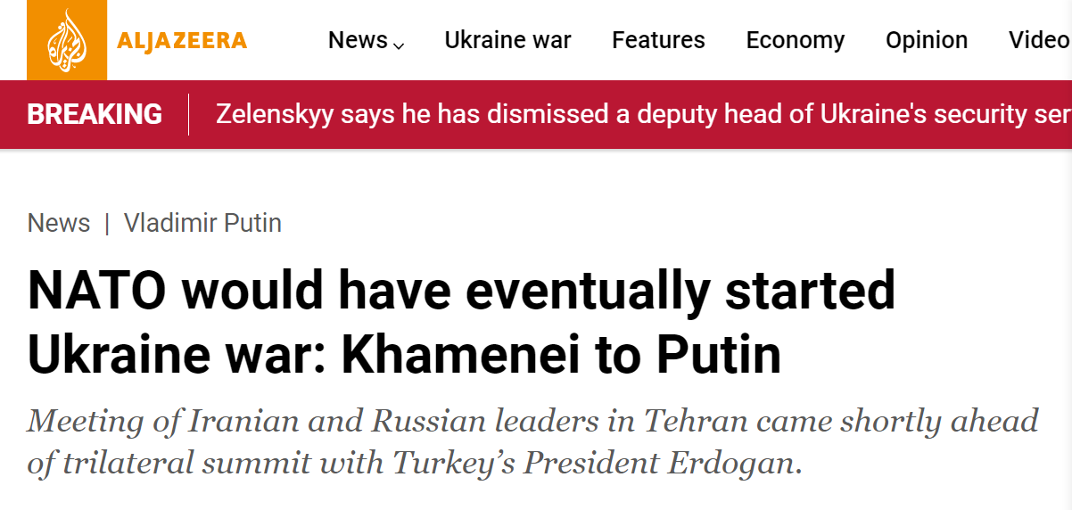 【环球网报道 记者 乌元春】俄罗斯总统普京正在伊朗进行访问,据卡塔尔半岛电视台19日报道,伊朗最高领袖哈梅内伊当天在德黑兰与普京会晤时说,即便俄罗斯没有对乌克兰发起军事行动,北约最终也会发动战争。