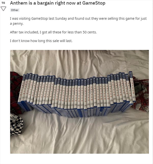 另一个消息来源则是玩家论坛,一个名为Spider-Man_Fan的Reddit用户晒出了一排《圣歌》游戏,声称这是他在Gamestop批发的——税后价41美分,该用户还晒出了他的小票,显示他支付了1美元、找零59美分。