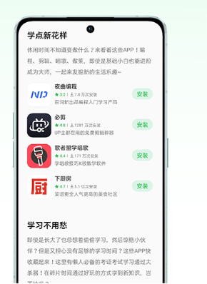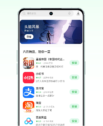 新版【应用时刻】栏目加强了应用核心信息的外显,帮助应用更直接地触达用户。卡片图采用 icon 大图、多 icon 动图,增强用户感知;子栏目【今日 APP】将资源类型与安装按钮直接展示在卡片外部,便于用户一键下载使用。