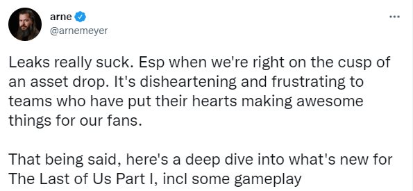 顽皮狗工作室副总裁Arne Meyer在官方视频发布后说道:“特别是当我们正处在资产下跌的风口浪尖上时。这对于我们整个全心全意为粉丝制作优秀内容的团队来说,太令人伤心和沮丧了。”