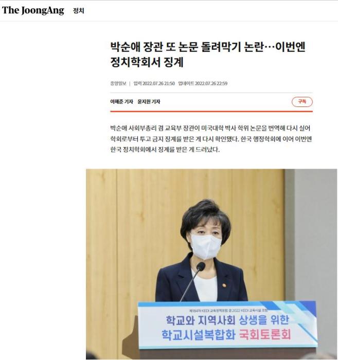 中新网7月28日电 据韩国《中央日报》27日报道,韩国社会副总理兼教育部长朴顺爱因将美国大学博士学位论文翻译后再次进行刊登,受到了韩国政治学会禁止投稿的处分。