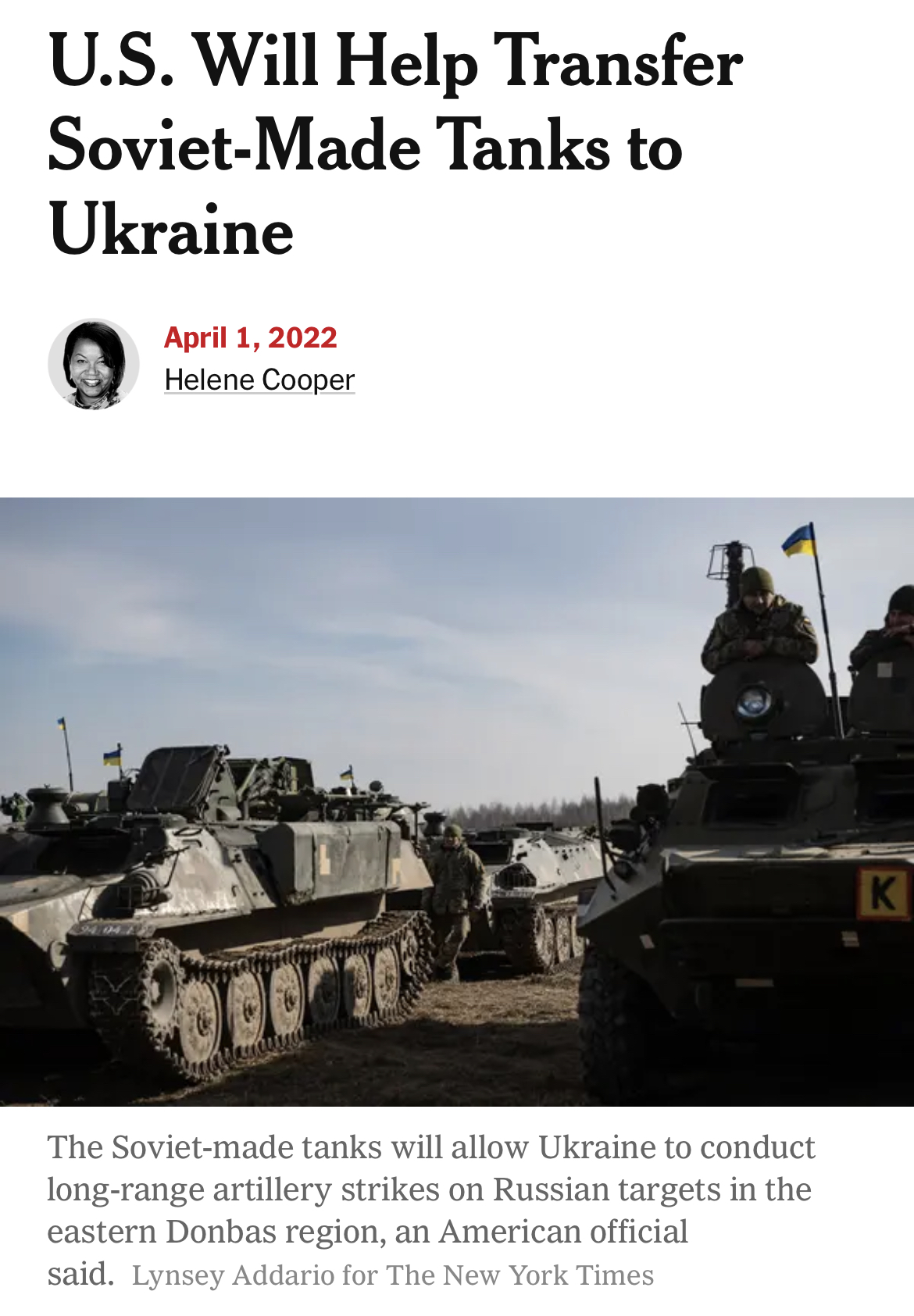 【环球网报道 见习记者 陈卓】据 《纽约时报》4月1日报道,一名美国官员当日透露,拜登政府将与盟国合作向乌克兰转运苏制坦克,以加强该国东部顿巴斯地区的防御,这将是俄乌冲突后美方首次协助向乌克兰转运坦克。