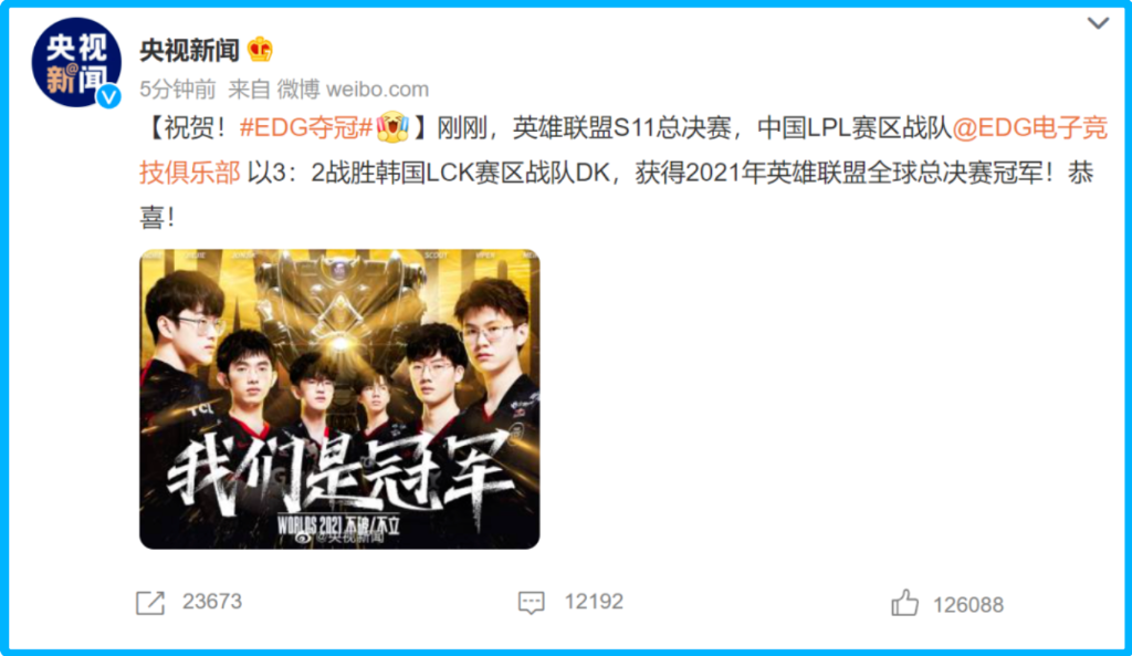 消息瞬间刷屏网络,电竞迷们激动欢呼,一边在社交平台爆赞“EDG牛!”,一边线下举着应援旗帜奔跑呐喊;围观群众不明所以,却也受到情绪感染,忍不住给相关内容点赞;就连央视新闻也*时间发文祝贺。