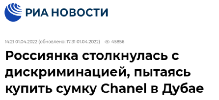 据报道,这名俄女子告诉俄新社,“昨天我在阿联酋购物中心选中了一个包,当我决定付款时,我被要求提供身份信息,我说出了自己的俄罗斯电话号码。一名售货员跟他们的经理走过来,这名经理称,从今天开始,对于俄罗斯顾客,只有在签署文件承诺不将商品带到俄罗斯并在俄使用时,才可以出售。”