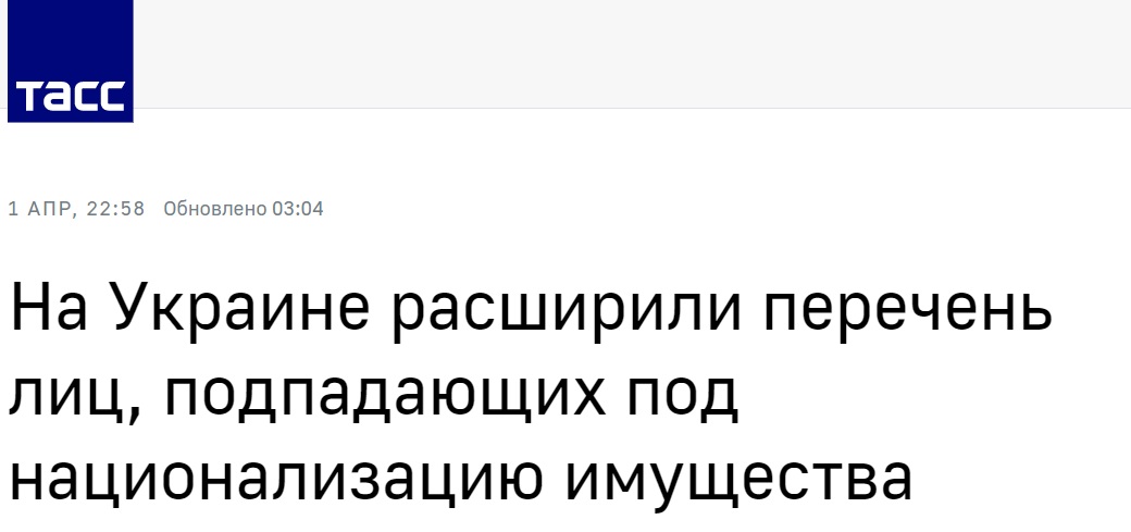 根据乌最高拉达公布的法案,经乌国家安全委员会和法院的裁定,除俄居民外,对于公开支持“俄罗斯侵略行为”、“乌克兰战时状态期间未停止在俄经济活动”的自然人和法人,其财产也会被国有化。