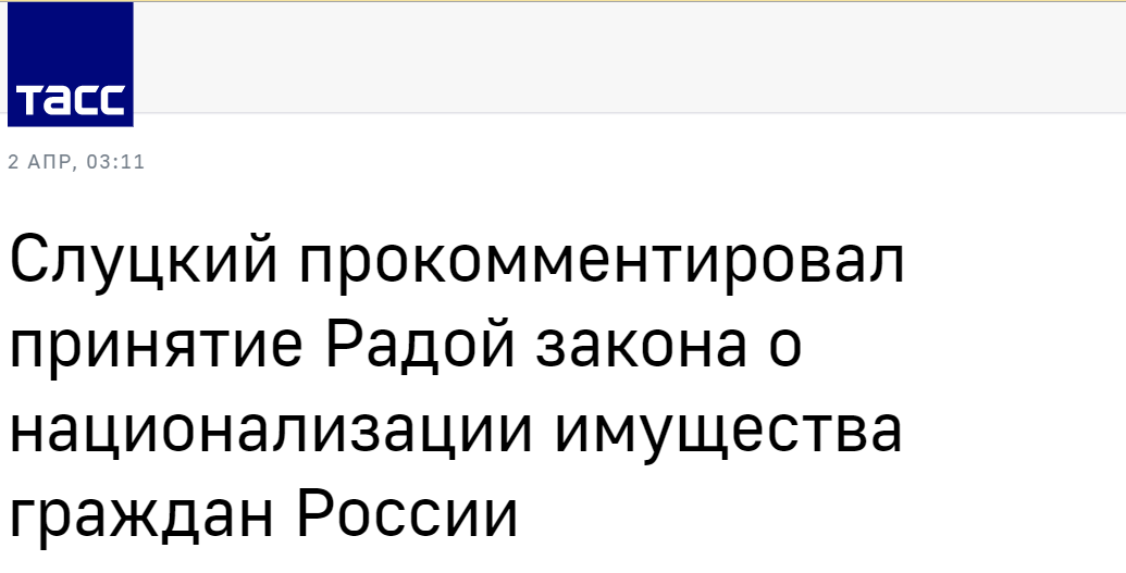 【环球网报道】综合俄罗斯塔斯社、《俄罗斯商业咨询日报》、“今日俄罗斯”等媒体报道,乌克兰总统泽连斯基所在政党人民公仆党4月1日称,乌克兰最高拉达(议会)通过了一项法案,要求扩大在乌财产应被国有化对象的名单。扩大后的对象包括俄罗斯公民、非俄公民但“与俄关系密切人员”以及公开支持俄特别军事行动人员(不论国籍)等。对此,俄国家杜马国际事务委员会主席斯卢茨基痛批称,乌克兰现政府“正在向世界展示自己的强盗面目”,“更准确地说,展示的是自己的丑陋嘴脸”。