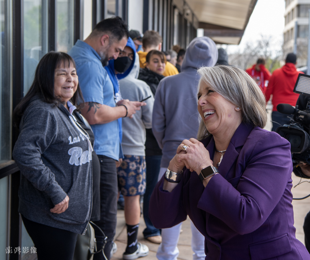 当地时间4月1日,新墨西哥州州长(右)与排队购买大麻的居民交谈