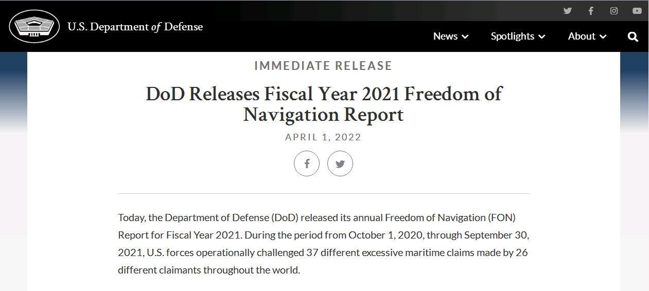 【环球时报-环球网报道 记者 马俊】五角大楼于4月1日发布2021财年的“航行自由行动报告”,累计在全球执行所谓“航行自由行动”共37次,涉及全球26个国家和地区,其中5次与中国大陆有关,1次与台湾地区有关。