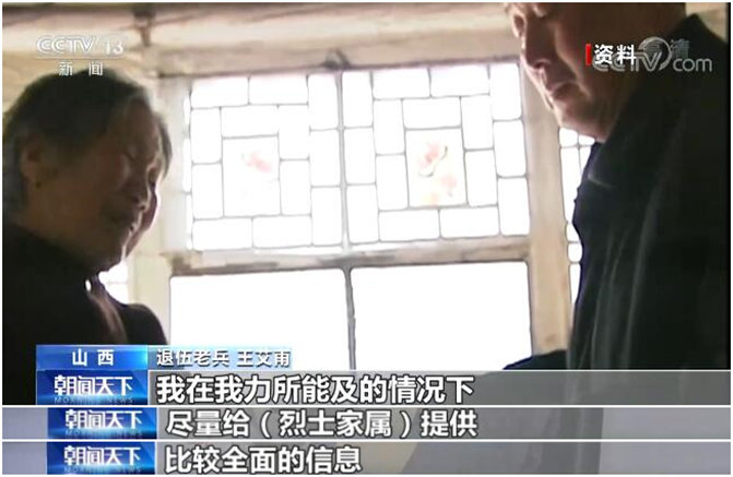 央视网消息:清明节是思念亲人、祭奠英烈的日子。目前,全国有196万余名登记在册的烈士,由于种种原因,一些烈士信息不够完整准确,一些烈属只知亲人牺牲,却不了解详细信息,不知其安葬的地址,更无从现场祭奠,为了让这些英雄能够魂归故里,很多人都在为他们寻找回家之路。今天(4月3日)的“我要找到你——为烈士寻亲”系列节目,我们来讲述退伍老兵王艾甫坚持20多年为阵亡烈士寻找亲人的故事。