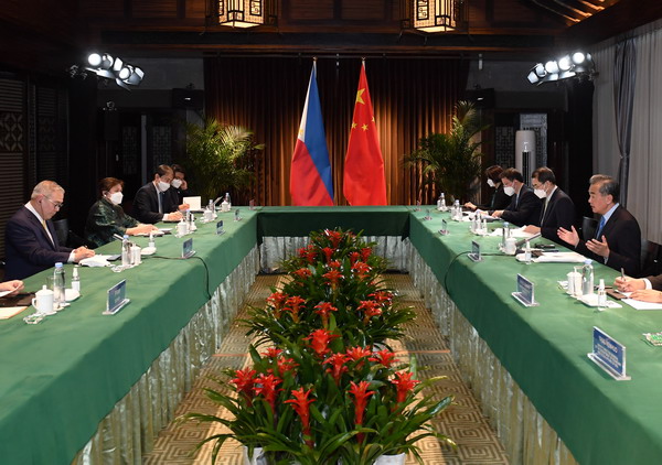 王毅说,中方始终将菲律宾放在中国周边外交的优先位置,中国对菲奉行的睦邻友好政策保持着延续性和稳定性。双方要排除干扰,冷静妥善管控分歧,不使其影响中菲关系大局。中方愿同菲方加快推进基础设施重点项目建设,助力菲“大建特建”取得更多成果,也愿继续根据菲方需要提供新冠疫苗援助,加强公共卫生合作。