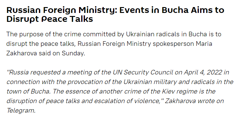 俄罗斯国防部在声明中说,所谓在布查市的“犯罪证据”却在4月3日俄军撤离的第四天,乌军和乌克兰媒体抵达以后出现了。俄国防部认为,这些来自布查市的照片和视频都是乌克兰政府为西方媒体导演的,是乌克兰政府的又一次挑衅行为。