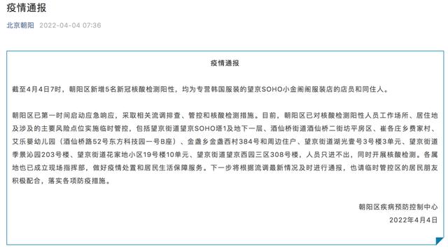 截至4月4日7时,朝阳区新增5名新冠核酸检测阳性,均为专营韩国服装的望京SOHO小金阁阁服装店的店员和同住人。
