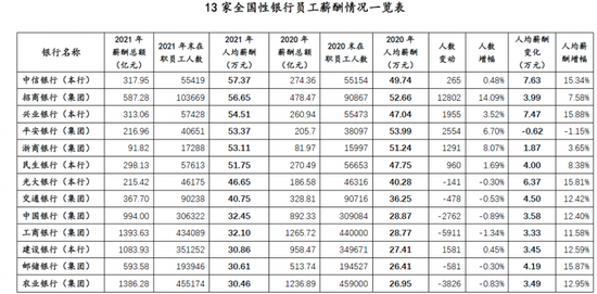 2021年,银行人喜迎涨薪。截至4月3日,A股上市的15家全国性银行已有13家披露了2021年年报。北京青年报记者统计分析年报数据发现,其中12家银行去年的人均薪酬都实现了正增长,6家国有大行全部突破了30万,其中交行超过了40万;7家股份制银行有6家人均薪酬超过50万,中信银行以57.37万的人均薪酬拔得头筹。