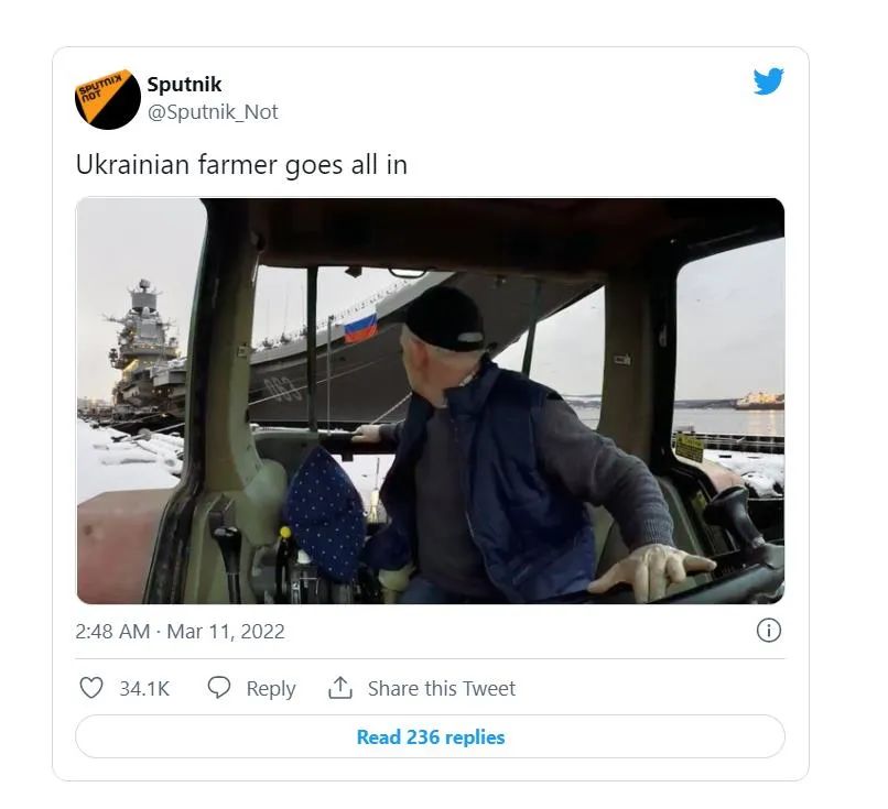 前不久,国外一个讽刺类的社交媒体账号上发布了一组无厘头的PS照片——乌克兰农民用拖拉机将俄唯一航母“库兹涅佐夫”号拖走、乌克兰农民拖走“联盟”号火箭、用拖拉机“猎杀”俄潜艇等搞笑画面。