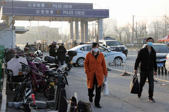 4月5日早上,在北京通州与河北三河交界的京榆旧路白庙北检查站,部分跨省上班族已符合疫情防控的相关要求,开始进京。